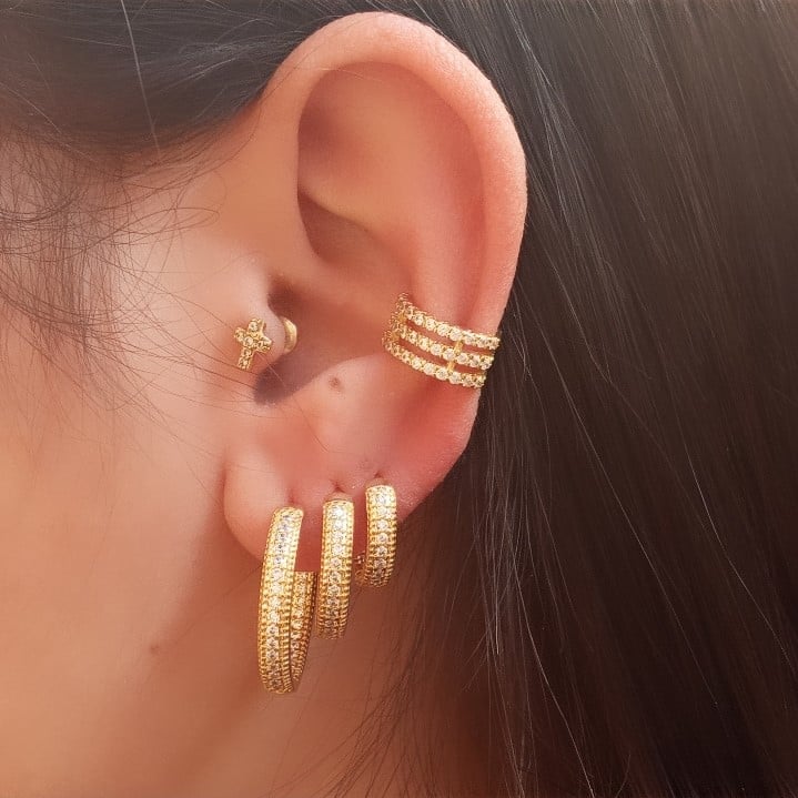 As argolas podem ser lisas e cravejadas em zircônias, no banho de outro 18k ou ródio, do mesmo modo são peças essenciais para ter!