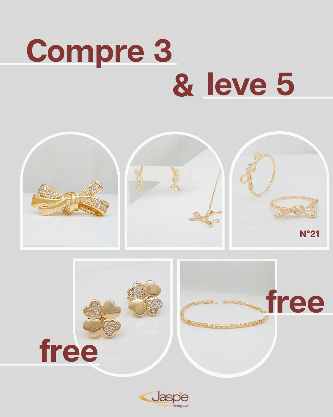 Inclui um anel N°21, um pingente laço cravejado, um par de brincos trevo, uma pulseira em fio pipoca 20cm 2,4mm e um conjunto brinco + colar com pingente cravejados com micro zircônias. Todas as peças conversam entre si. Além disso, podem ser usadas juntas ou separadas, o que aumenta as possibilidades de venda.