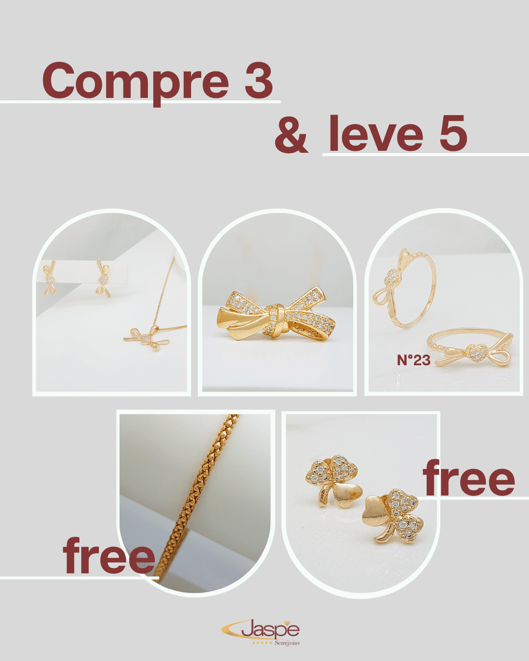 Inclui um anel(N°23) laço cravejado, um par de brincos, pingente laço cravejado, um conjunto de brinco + colar cravejados com micro zircônias e uma pulseira 2,4mm em fio pipoca. Todas as peças conversam entre si. Além disso, podem ser usadas juntas ou separadas, o que aumenta as possibilidades de venda.