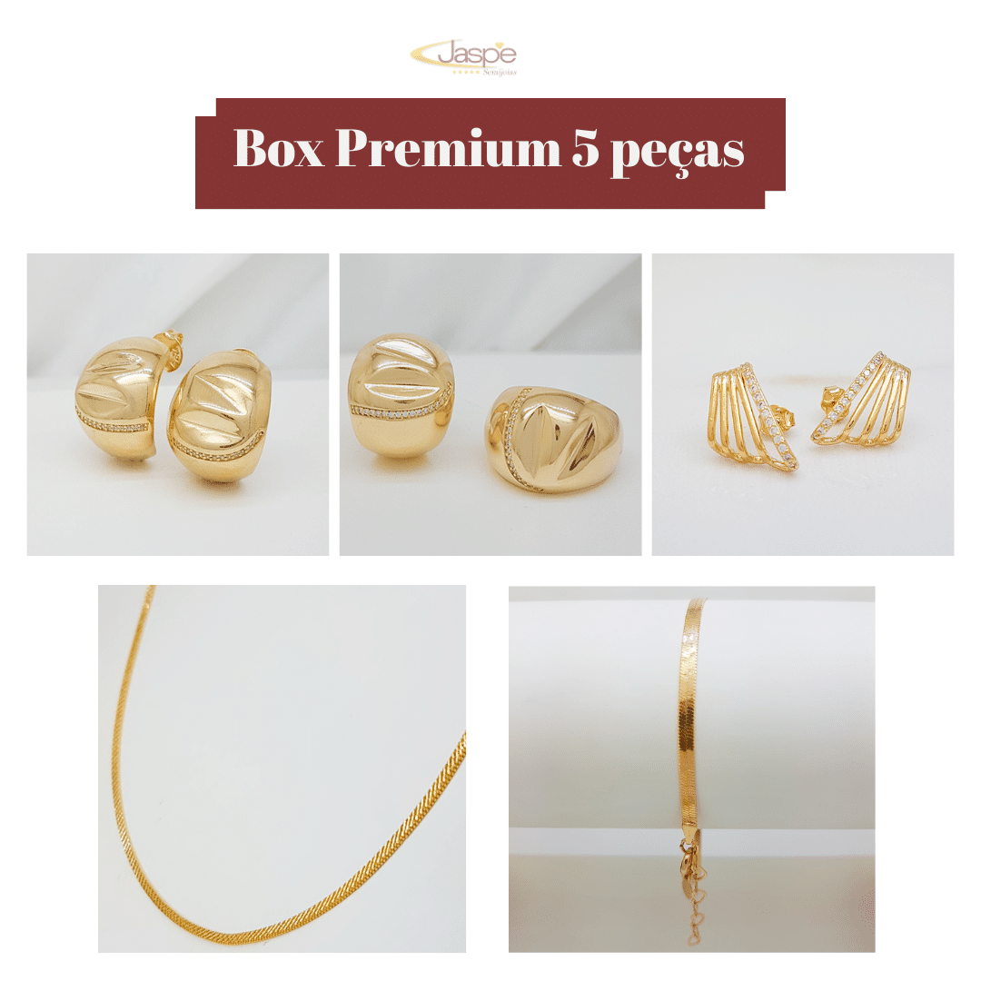Este Box Premium traz 5 peças selecionadas especialmente para oferecer sofisticação e versatilidade. Cada semijoia foi escolhida com atenção ao design e ao acabamento. Assim, você garante variedade no seu mostruário e encanta suas clientes.