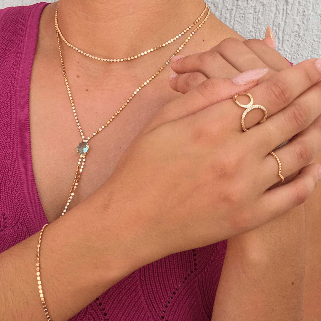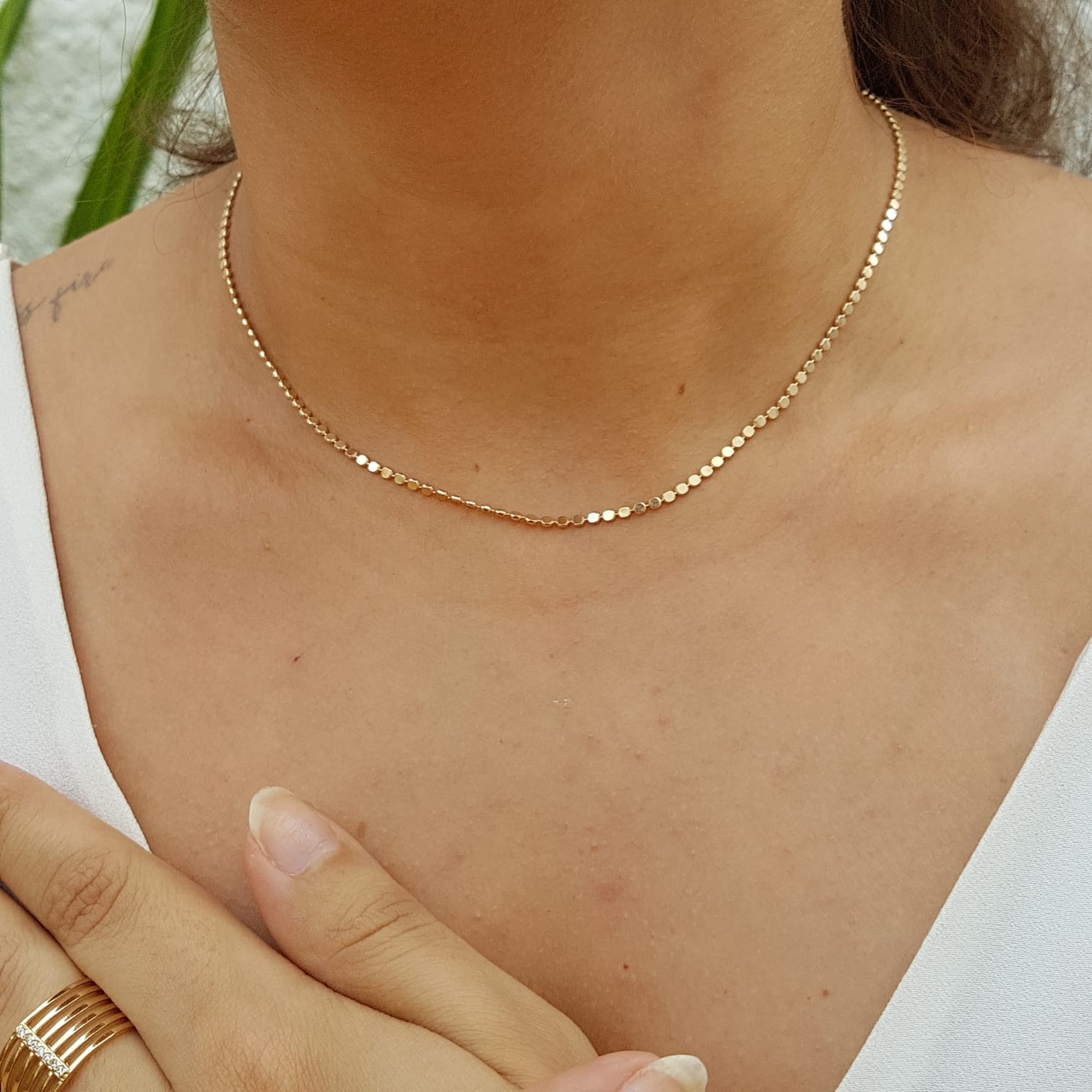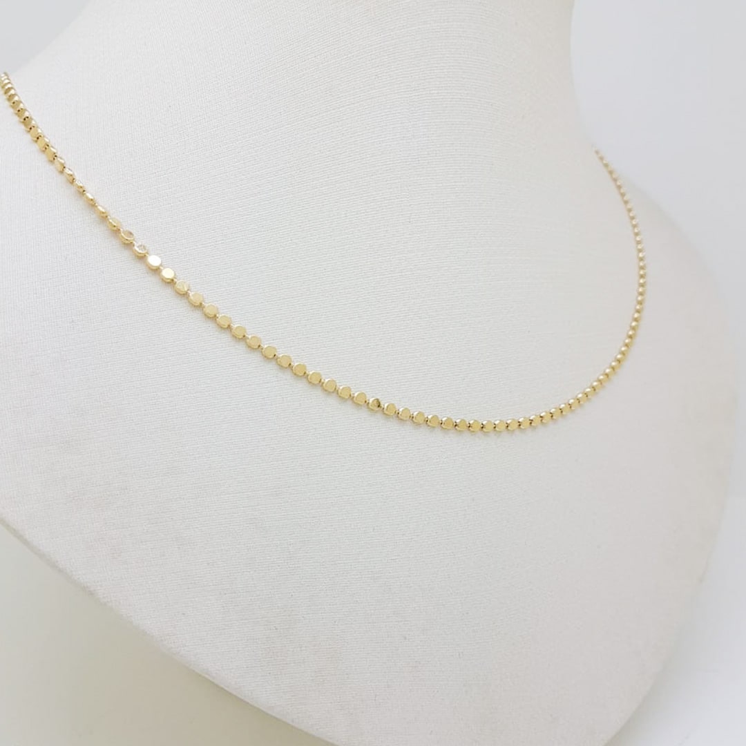 Colar Bolinha Chata 1mm Folherado Ouro 18K. Perfeito para complementar seu look. Use com a pulseira e tornozeleira de bolinha chata!