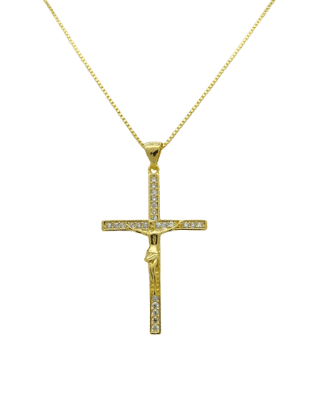Colar Cruz com Cristo 35mm – Banho Ouro18k, perfeita para agregar brilho e elegância ao seu look.