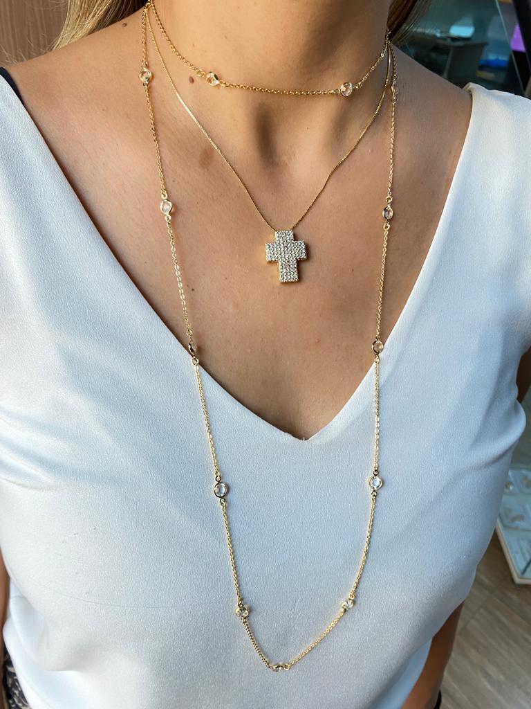 Colar Cruz Micro Zircônia 20/25MM – Banho Ouro 18k, perfeita para agregar brilho e elegância ao seu look.