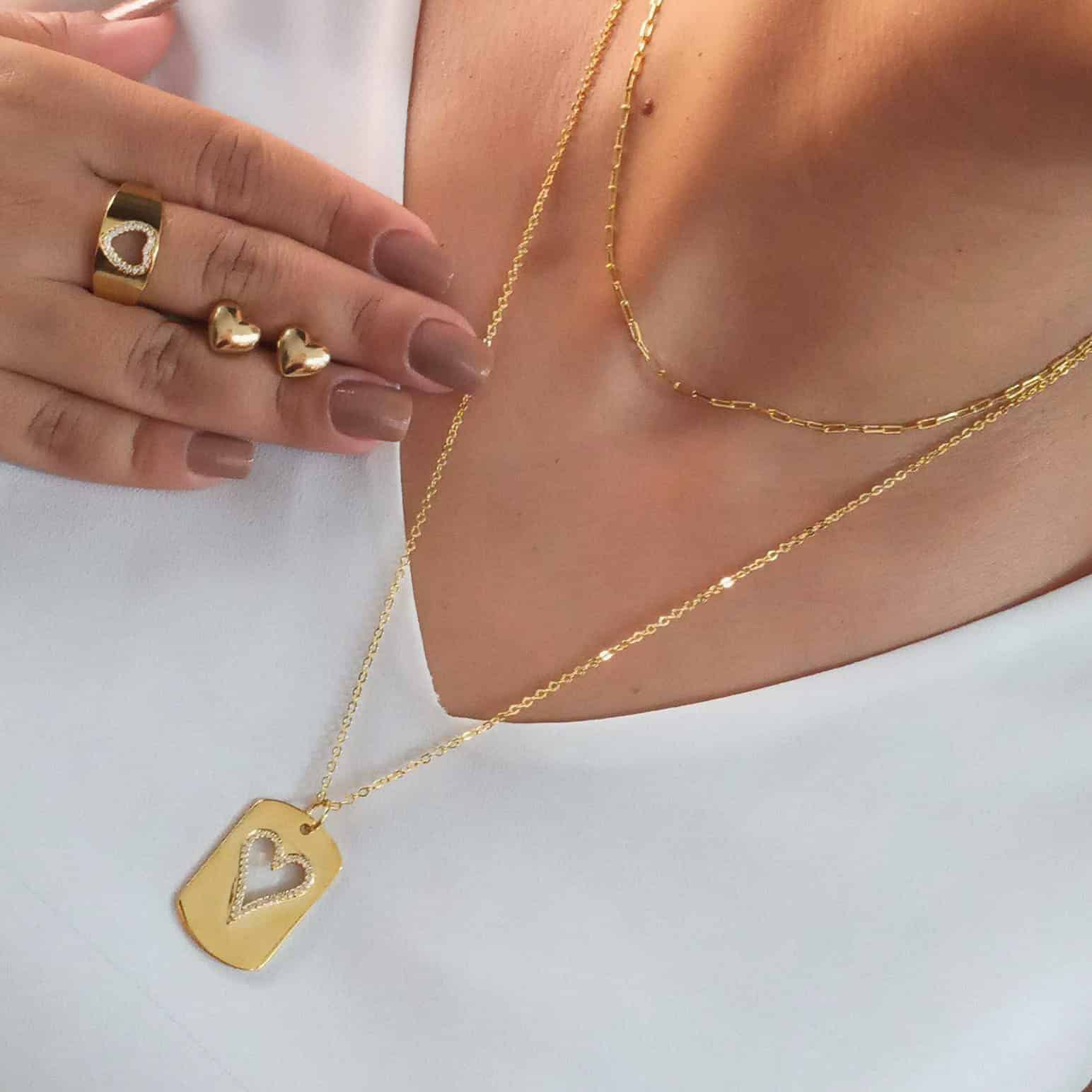 Colar Duplo de Placa Coração Vazado com Zircônia Banho Ouro 18K. Perfeito para agregar delicadeza e elegância ao seu look.