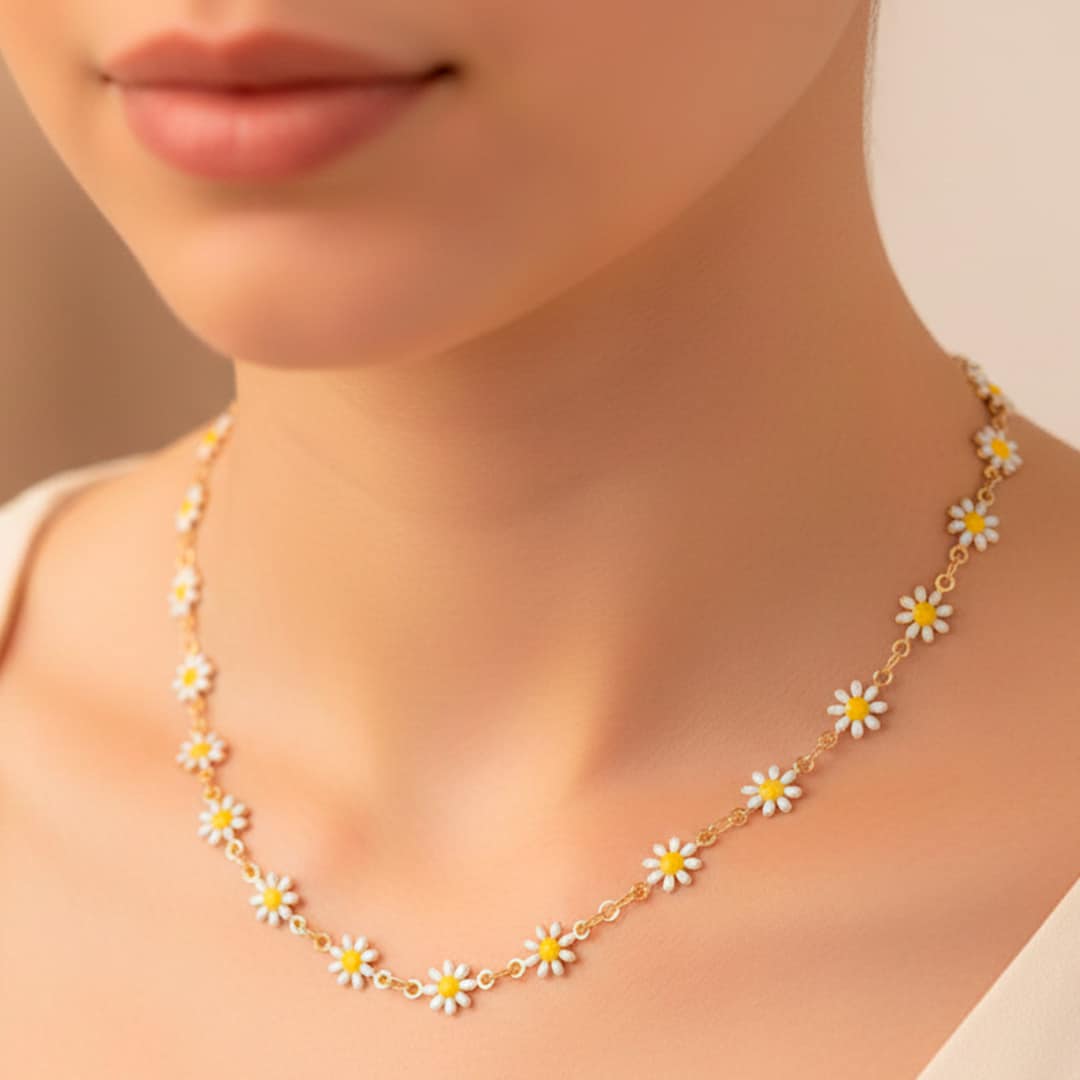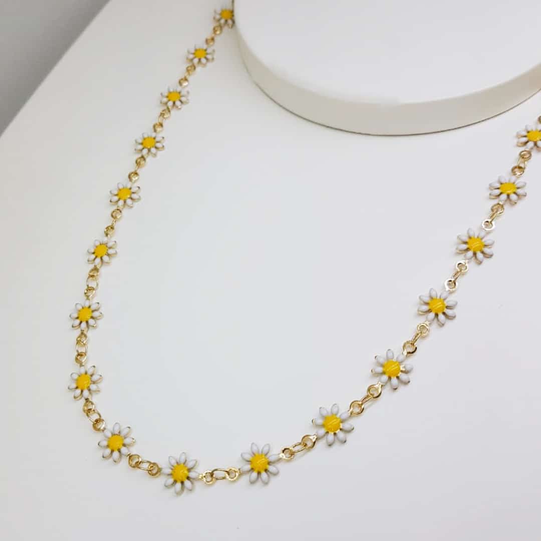 Colar Margarida em Resina folheado a ouro 18k, com design delicado e acabamento moderno. Peça leve e versátil, ideal para compor looks atuais e atrair clientes que buscam charme e diferencial no mix de semijoias.