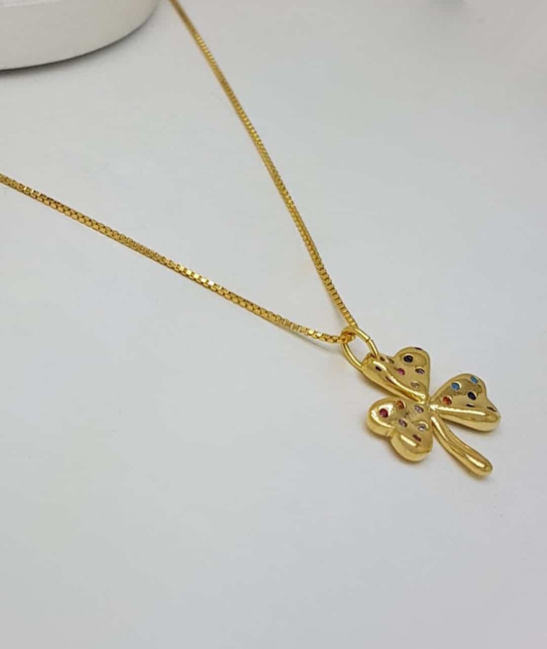 Colar Trevo Zircônias Coloridas Folheado Ouro 18K. Perfeito para agregar beleza e cor ao seu look.